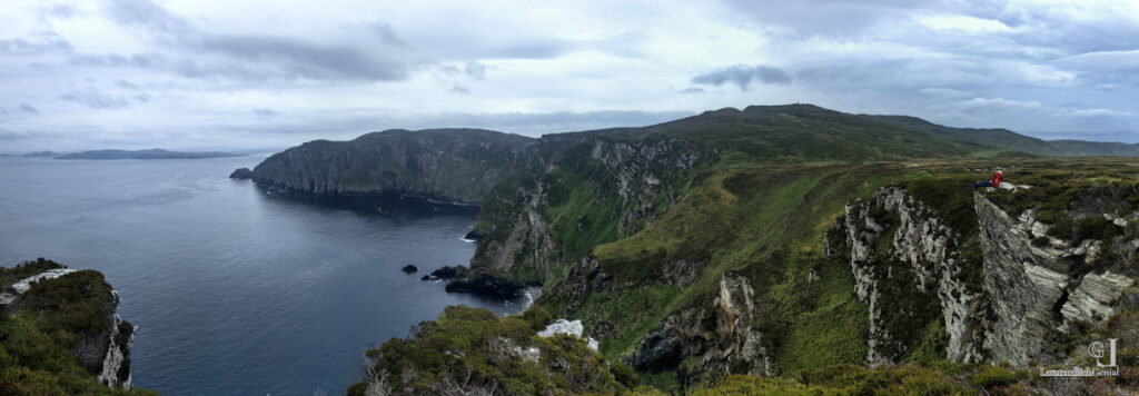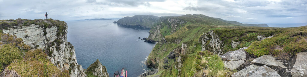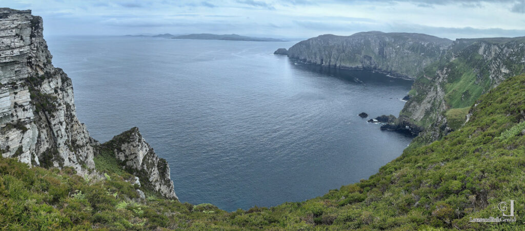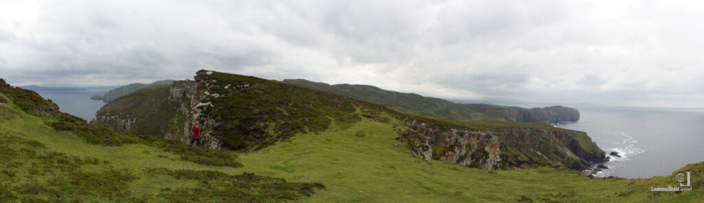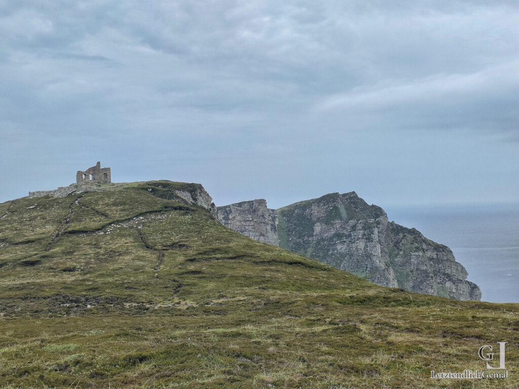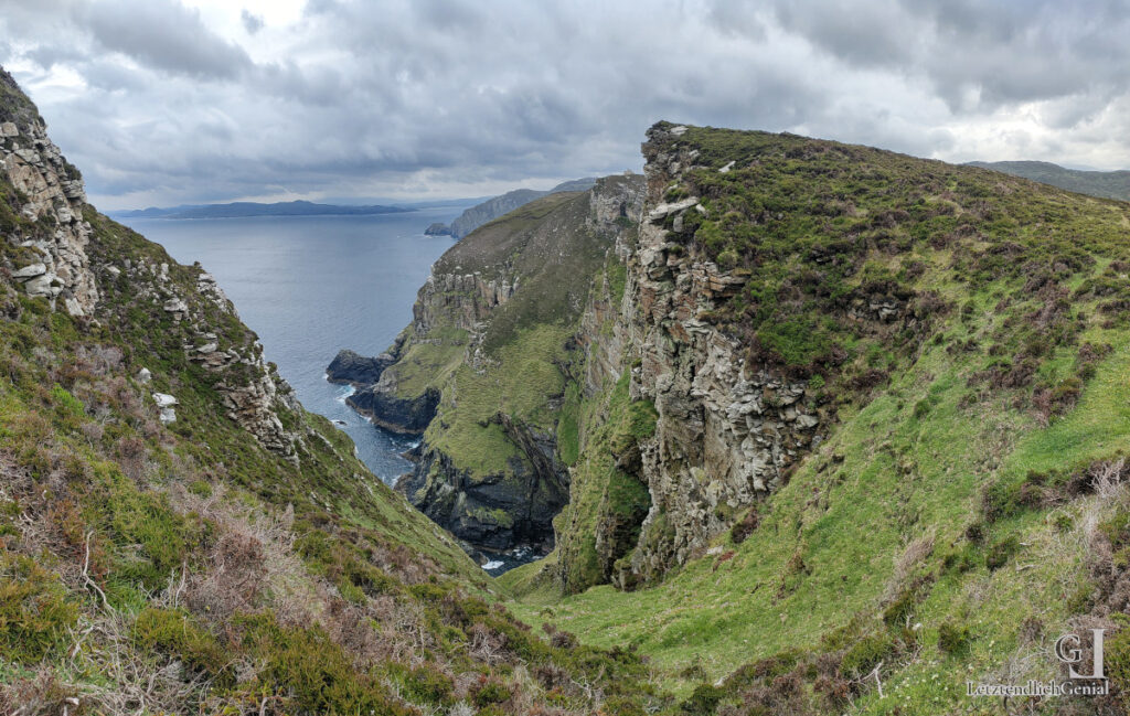 Der Vormittag gelingt noch gut, das Wetter hält und wir können die wirklich spektakuläre Küste am Horn Head mit ihren steilen und wilden Klippen ausgiebig erkunden. Der Weg führt über immergrüne torfige Heidelandschaft auf etwa 420 Metern Höhe!
