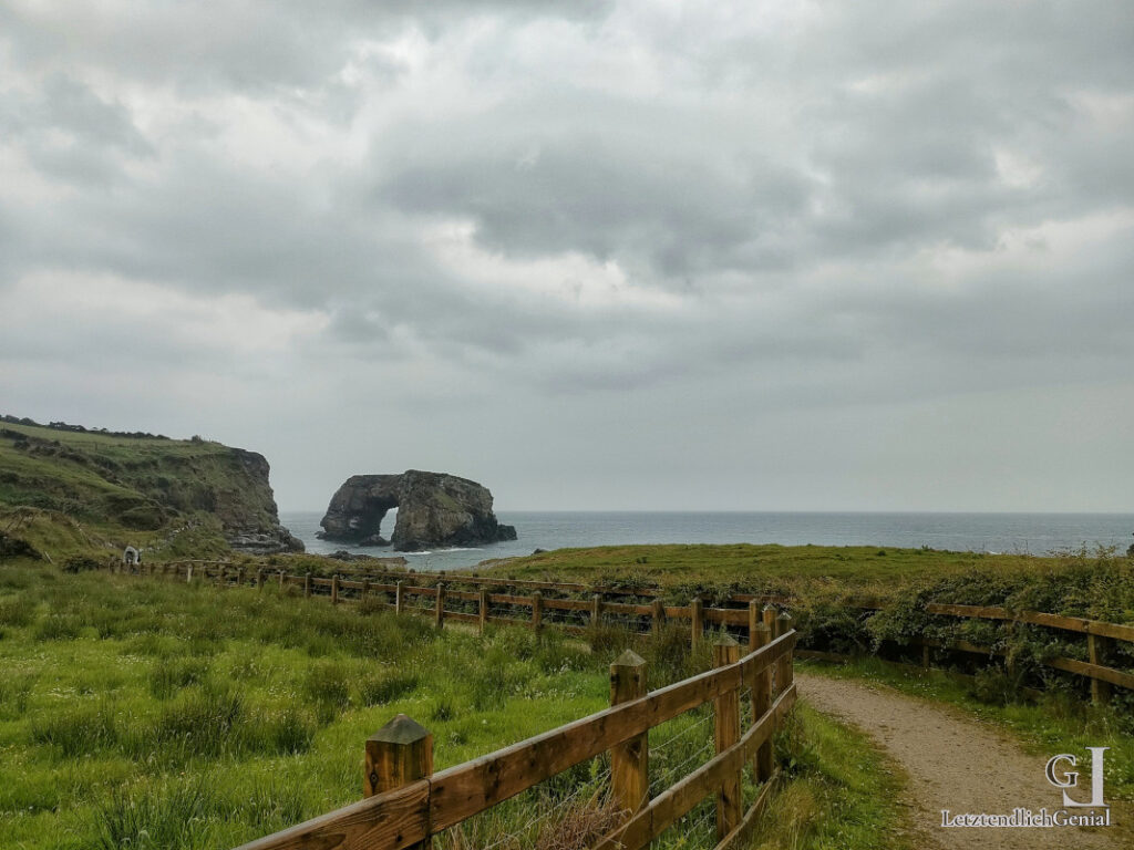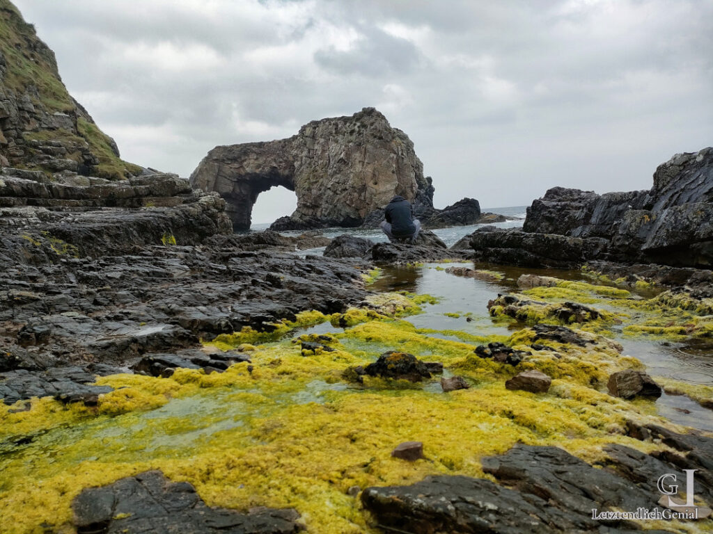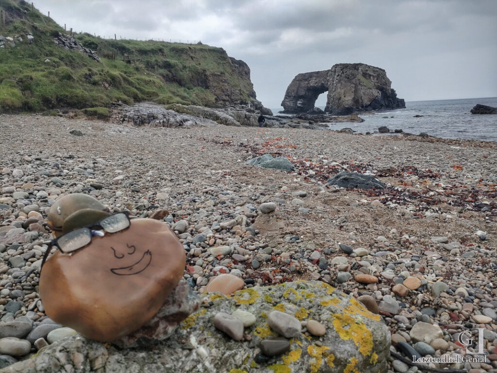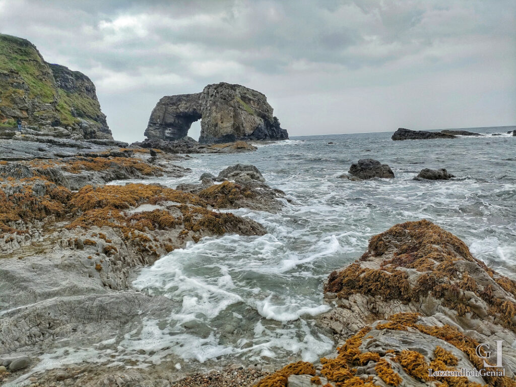 Während einer kurzen Regenpause schaffen wir es ‚just in time‘ Irlands größten, vom Atlantik mit millionenjahrelanger Geduld geformten Steinbogen zu besuchen! Schick sieht er aus! Wir finden schon, dass der 20 Meter hohe Koloss einen Besuch wert ist!