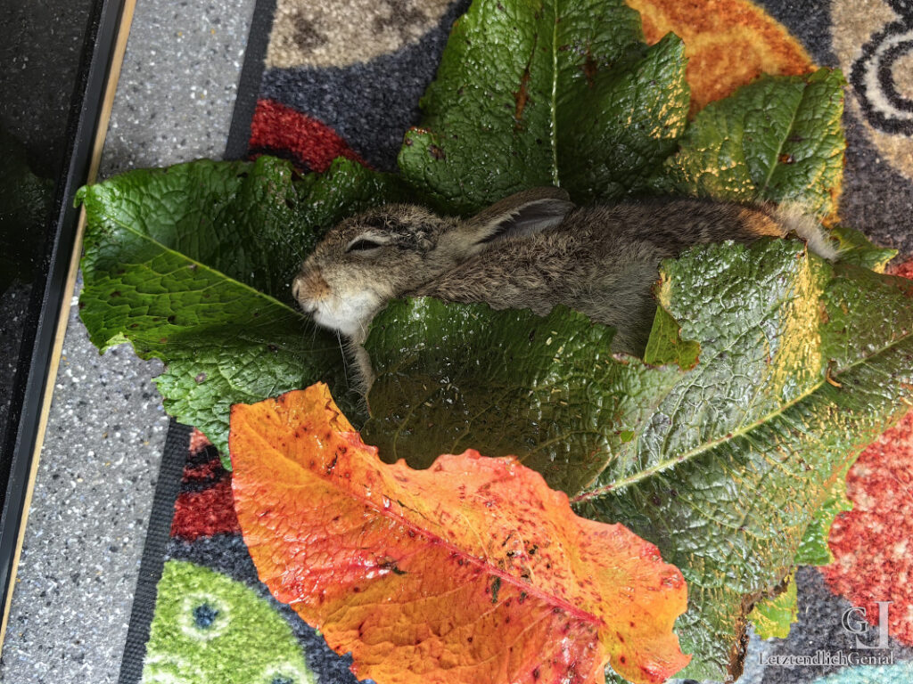 Da fehlt gerade noch, dass unweit vom Parkplatz, da wo kurz zuvor ein Auto gewendet hat, ein ganz junges Kaninchen am Wegrand kauert – völlig durchnässt und unterkühlt!! – Ohje!! Das können wir doch nicht einfach so sitzen lassen!