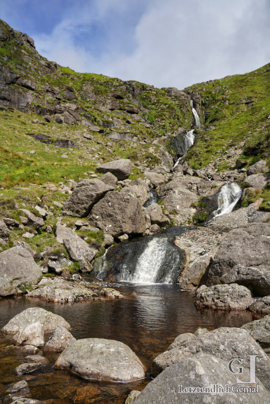 Laut Internet ist das etwa 150 Kilometer entfernte Cork eine sehenswerte bunte Stadt – die soll’s heute werden. Dazwischen steuern wir mit einem kleinen Umweg die 80 Meter hohen Mahon-Falls in den Comeragh-Mountains an.