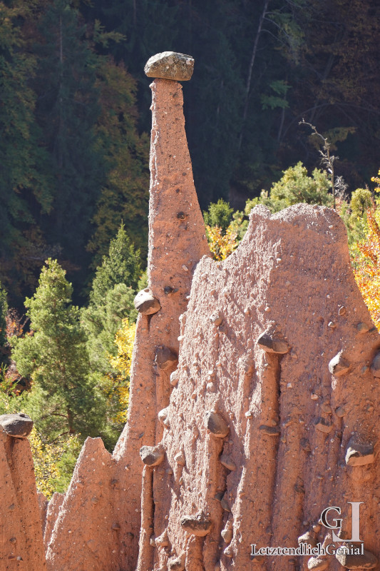 Jeweils rings um einen ‚Deckstein‘ erodiert das Lehm-Konglomerat durch Regen weg und bleibt, bis der Decksstein herunterfällt, als steile Erdpyramide stehen und zu bewundern;)