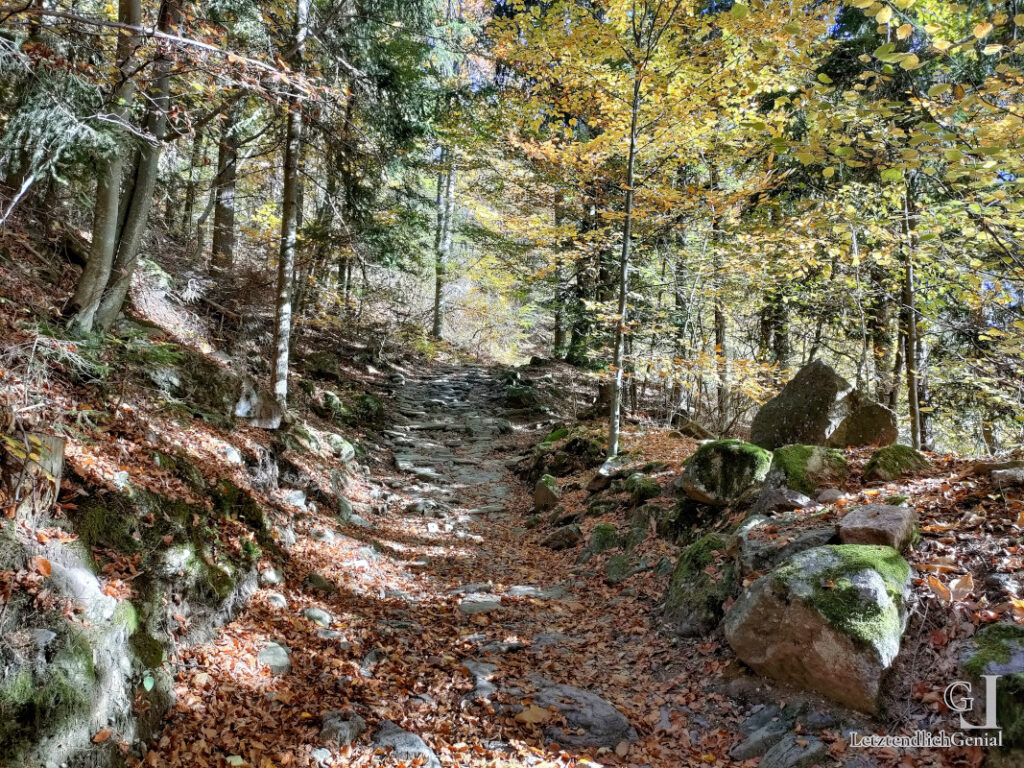 Es ist ein schöner Weg, allerdings jetzt zeitweise im Schatten und da er im Hochplateau verläuft auch ohne weiteres Bergpanorama.*Basst scho* – Hatten wir ja heute schon;)