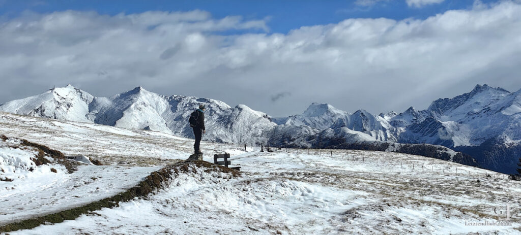 Nach einem knackigen, kurzen Anstieg dürfen wir dann das Alpenpanorama sozusagen als Privatvorführung genießen. Hier oben muss es die letzte Nacht geschneit haben, es liegen ein paar Zentimeter Neuschnee, was bei vorherrschendem herrlichen Sonnenschein nicht weiter stört;)